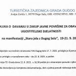 Turistička zajednica Grada Dugog Sela kao organizatori, raspisuje javni natječaj za davanje u zakup javne površine u Gradu Dugom Selu tijekom održavanja manifestacije „Stara jela z Dugoga Sela“ ,19., 20. i 21. rujna 2024. u centru Dugog Sela za obavljanje ugostiteljske djelatnosti.