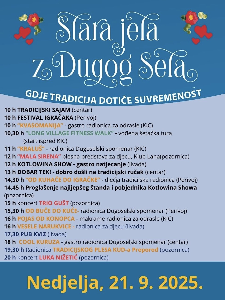 Samo nas nekoliko dana dijeli od najveće dugoselske manifestacije. Brojne Dugoselke i Dugoselci već tjednima imaju pune ruke posla kako bi trećeg rujanskog vikenda svim gostima svog grada pružili najtopliju dobrodošlicu. Navratite! Čekamo vas 19. – 21. rujna!